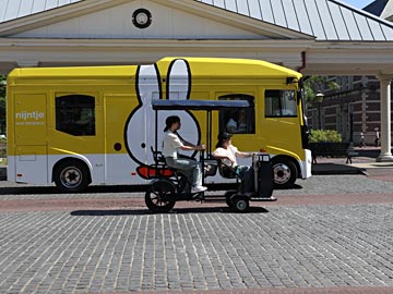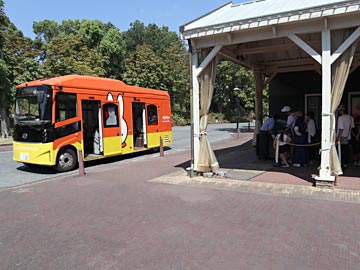 中央の園内バス乗り場「ホテルアムステルダム」から、ハーバータウンまでパークバスに乗りました。我々が乗ったのはオレンジ色のミッフィー。手前の4人乗りの自転車は、2つの自転車を横に並べてくっつけているのですが、左側がパナソニックの電動自転車なので、こぐのは楽そう。