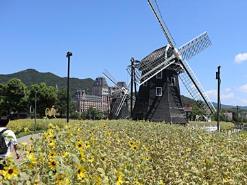 出入り口に向かうフラワーロード。3基の風車は風もないのに元気にぐるぐると回っていました。
