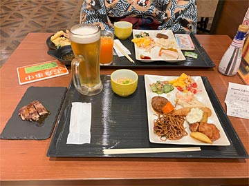 夕食は西館1Fのレストラン会場でバイキング。アルコールは有料で、一杯だけ中ジョッキを発注。¥869。