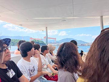 軍艦島デジタルミュージアムから、歩いて5-6分のところに乗り場があり、プレミアム・スーパープレミアムの人は引率されて来ますが、(当方のような)スタンダードの人は自分で歩いて来て、待合所で待ちます。スタンダードは、番号(恐らく来た)順に、1Fの自由席に座ります。