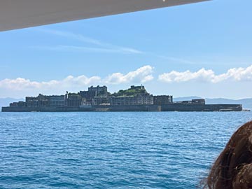 (桜島と)同じように、以前から機会があったら行ってみたいと思っていた軍艦島に行って来ました。5社が上陸ツアーを提供しているそうです。今回はミュージアムも提供している大手のツアー会社を予約して参加しましたが、上陸時に波が50cmを越えていると上陸できず、船上から見るだけになってしまうのだそう(上陸率はどの会社でも60%程度)。船酔いにはコカ・コーラが効くと聞いたので、500mLのペットボトルを持参しましたが、今回は波も穏やかで酔うこともありませんでした。でも、ものすごく暑かったので、ペットボトルは空になってしまいました。