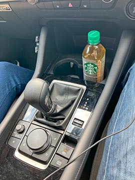 今回のレンタカーは、楽天で調べて、軽自動車以外で、空港から徒歩で行けて、保険込みで一番安かったタイムズレンタカー(5日間¥38,180)。この車(マツダ3)はカーシェアリング(駐車場に置いてあるやつ)で使われている車両らしく、リアウィンドウに会員カードを押し当てる「TOUCH」の印がありました。