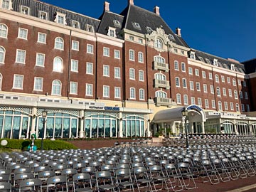 外に出てみました。ずらっと並んでいるのは、昨日も開催された「サマーナイト花火」の有料席。目の前で打ち上げられるので、すごい迫力だと思われます。
