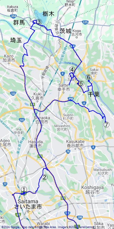 埼玉県、群馬県、栃木県が1点で交わっています。