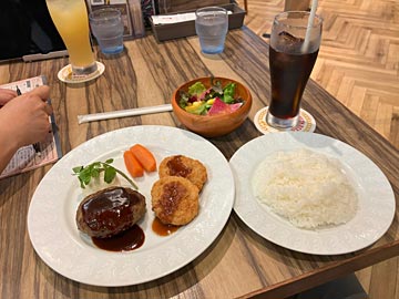 ライオンで「バーグ&ヒレカツのランチ」を食べながら、謎を解きます。謎解きキットに付いていた「特典クーポンチケット」で、飲み物がタダでもらえました。