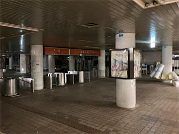 ふさがれた壁の上の隙間から撮った、使われていない改札口。