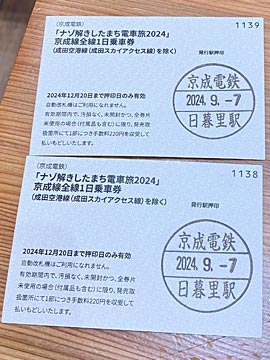 今回ナゾ解きに付いてきた、京成線全線1日乗車券。大きさは磁気カードですが、磁気は入っていないタダの紙なので、改札で駅員さんに見せて通してもらいます。空港第二ビル駅の改札とかでは、手に取ってしげしげと確認されました。