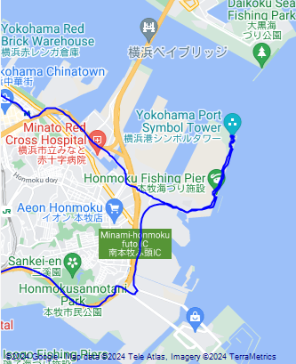 今回の軌跡。湾岸線で来て、日本大通りの方に帰りました。