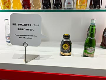 多摩工場は従業員200名、3交代制で、24時間休みなく稼働しています。多摩工場の見学コースは、向かって左がペットボトル、中央が缶製品、右がビン製品、と3種類の製造ラインが見学できます。この工場には全部で5つの製造ラインがあり、残る2つは、ファミレスとかのドリンクバー用に、業務用タンクに飲み物を詰めているらしい。