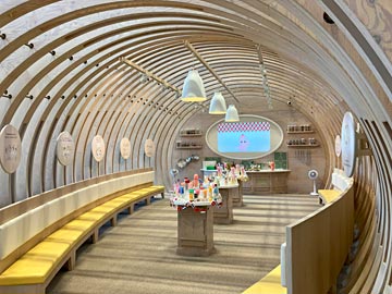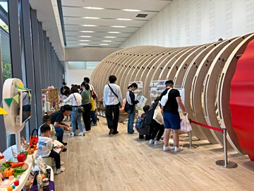 (2) 大きなマヨネーズのドーム(おいしさの秘密についての紹介)。マヨネーズは、卵の黄身と油(菜種、大豆)、お酢と、あと塩などで出来ていること。酸素が苦手なので、容器は酸素を通さないように多層容器になっていること。日本・海外で売っている色々な種類のマヨネーズについて教えてくれました。