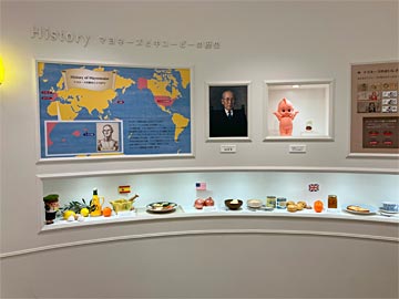 見学コースは4つのコーナーに分かれています。最初は (1)キユーピーギャラリー。こちらは歴史や歩み。マヨネーズが生まれたのはスペインのメノルカ島。日本には、キユーピー創始者の中島董一郎氏がアメリカ留学中においしさに感激して日本で初めて製造・販売したのだそう。