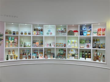 こちらはキユーピーの製品群。胡麻ドレッシングは日本で一番売れているとのこと。卵の黄身や白身が入っている業務用パック(牛乳パックの大きいみたいなやつ)も売っています。キユーピーグループでは、年に42億個の卵を使っていて、これは日本の卵の1割にあたるのだそう。