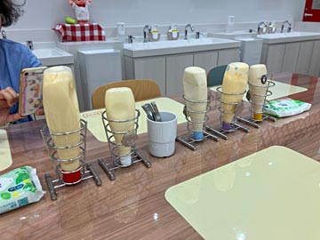 (4) キューピーキッチン(スティックきゅうりにマヨネーズを付けて味比べ)。赤いキャップ:昔からあるマヨネーズ、白:カロリーハーフ、水色:特定原材料8品目不使用(卵、乳成分、小麦、エビ、カニ、クルミ、ソバ、落花生)、紫:アマミ油を使ったマヨネーズ、黄色:燻製マヨネーズ。燻製マヨネーズがおいしかった。