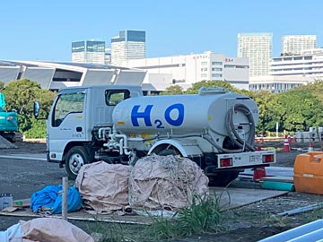 有明親水海浜公園を造成中の工事現場に、水のタンクローリー(?)がいました。H2Oと書くとちょっと高尚な感じ!?