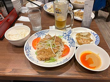自宅近くまで帰って、バーミヤンで夕食。ユーリンジー(油淋鶏)のセット。味変用の胡麻ソース付き。
