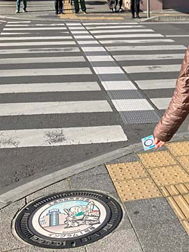 店の前にあった、デザインマンホール(白黒)とハイポーズ。