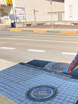 道路を戻ったバス停に、実物のカラーマンホール(泉野明巡査)があり、ハイポーズ。