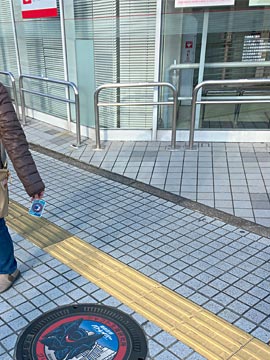 近くの道の反対側、銀行の前に実物のカラーマンホール(グリフォン)があり、ハイポーズ。