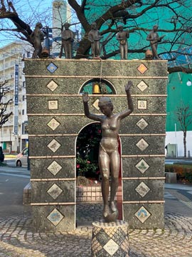 聖蹟桜ヶ丘駅で降りて、近くの大栗川と乞田川の写真を撮りに行きます。このスタチューは、道の途中にあった、中野滋氏の「楽人のプラッツ」。