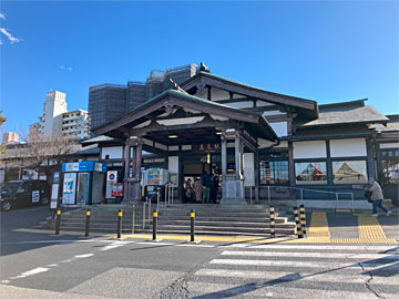 JR高尾駅。この社寺風デザインの北口駅舎は(中略)大正天皇の大喪列車の始発駅として新宿御苑に設置された仮設駅舎を移築したもの(リンク)だそうで、立派です。