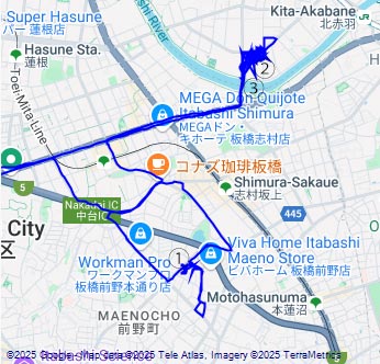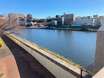近くの 新河岸川(しんがしがわ)を見に行き、写真を撮りました。反対側の川岸に「小豆沢(あずさわ)発着場」が見えます。