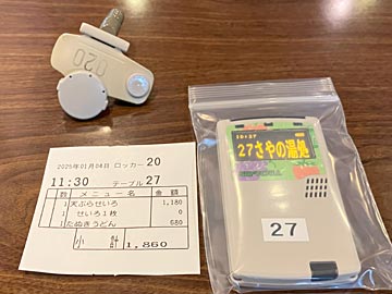 風呂のあと、食事処「柿天舎」でランチにしました。ロッカーキーは靴箱のものですが、丸いIC(RFタグ)が付いており、これで支払いできます。