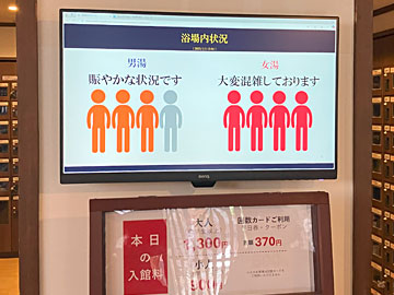 食事のあとは、「うたたね処」で昼寝しようかと思いましたが、満員だったので退館しました。帰る頃、男湯の混雑度合いは変わっていませんでしたが、女湯は「賑やか」から「大変混雑」に変わっていました。