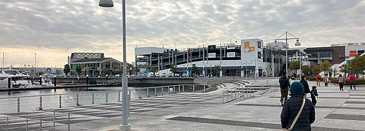 画面中央の一部スロープになっているところが、Bブロック。1Fがメルセデスベンツで上は駐車場。その右奥がAブロック(メインのアウトレット)。画面の一番右に見える斜めになっている建物が「ユニクロ PARK 横浜ベイサイド店」