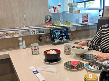 11時過ぎだったので、Cブロック1Fの回転寿司「函館まるかつ水産」に並んで入りました。今どき、お寿司は回っておらず(宣伝のフダとワサビだけが回っている)、タブレットで注文するのですが、お会計の時は店員さんが来て、お皿の色と数をかぞえていたのが印象的(電子化・省力化できるはずなのに…)。いつものように安いネタを中心に注文しましたが、暗算が得意な妻が「もう一皿食べないと¥3,000にならない」と言うので、当方がデザートのバニラアイスを発注し、ちょうど¥3,300。駐車場が2時間延長できました。