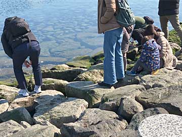 マリーナ手前の磯では、子供たちがスルメでカニを釣っていました。
