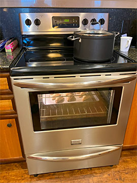 部屋に戻り、オーブンでクレセントを焼いています。円筒の包装を開けると、「ポン」と音がします。