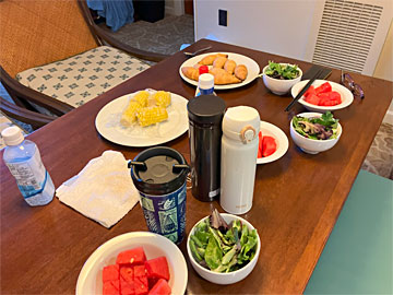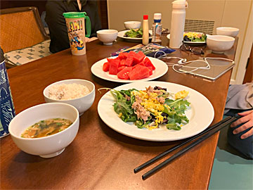 朝食は、日本から持ってきたご飯とお味噌汁、昨日「アイランドカントリーマーケット」で買ってきたサラダとヨーグルト。