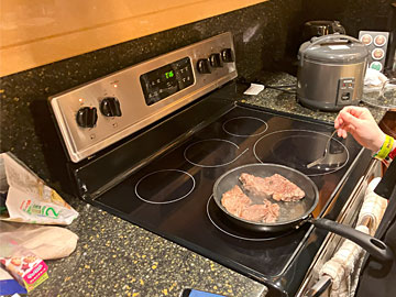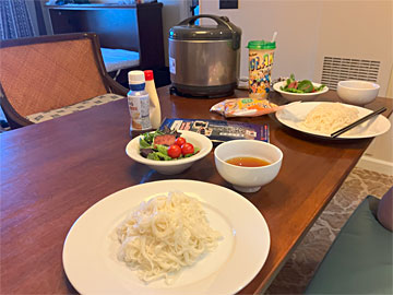 昼食は、日本から持ってきたそうめん。炊飯器は部屋の備品です。