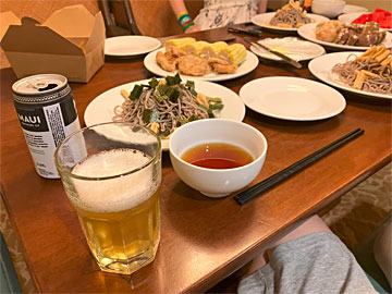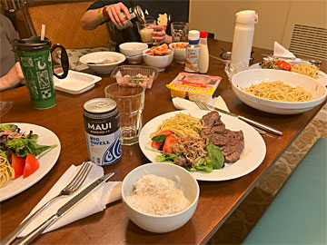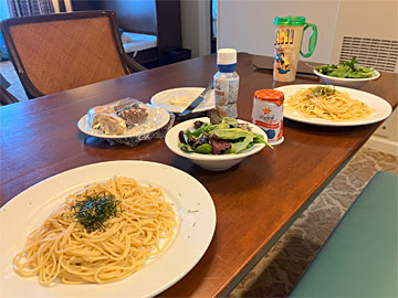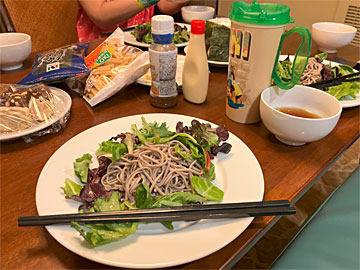 夕食は、日本から持ってきたおそばと、フードランドファームズで買った鳥の皮とトウモロコシ、チーズケーキファクトリーでテイクアウトしてきたパン、など。
