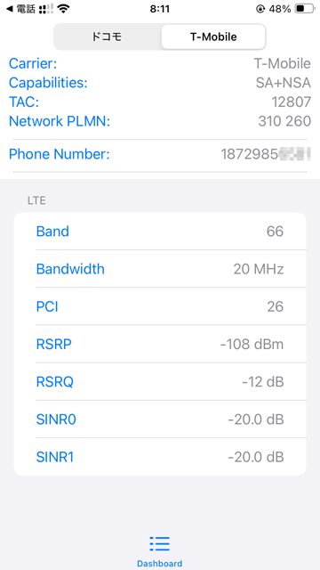 スマホは、eSIM対応であることと、T-Mobile主要周波数バンドであるB2とB4の両方に対応している必要があるのですが(実際確認したところ、B2とB4の拡張バンドである、Band66になっていることが多かった)、我々のスマホは、iPhoneSE2とSE3で、問題なく使えました。