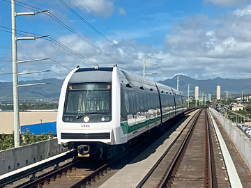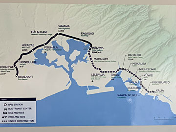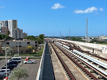 ハラワ駅(アロハスタジアム)から見た(まだ営業運転していない)ホノルル空港(延伸)方向。グーグルマップで空から見ると、ホノルル空港までは、線路は既に敷かれているようです。