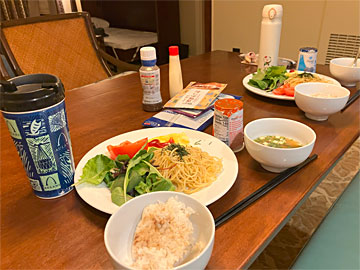 朝食はご飯と味噌汁、スパゲッティ