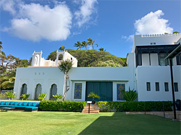 シャングリラ邸は、ドリス・デュークさん という稀代の大金持ちの女性が建設した別荘で、12歳の時に、お父さんがなくなり、莫大な遺産を受け継ぎました。成人した彼女が、 世界中を巡る途中でイスラム文化に衝撃を受け、ハワイに別荘を建設してイスラム文化のコレクションを集めたものです。ダイヤモンドヘッドの直ぐ近くに位置し、海沿いのすばらしい場所に建っています。