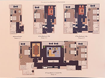 部屋のレイアウト図。下段が3ベッドルームヴィラ。我々の1ベッドルームヴィラ(上段真ん中)の3倍あります。