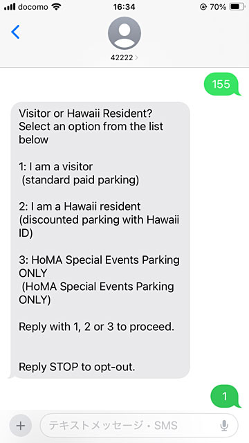 ホノルル美術館の駐車場は、以前は係の人がいたようでしたが、今は無人で、SMSで連絡すると(画面)、WEBページに導かれて、そこで車のナンバーを入れてカード払いします。スマホを持っていない場合は?という選択肢もあったようですが、今回当方が持ってきたSIMは、アメリカの音声付きなので、SMSが使えます。駐車時間は、初期値が3時間で、変更できるようでしたが、うまく変更できず(3から変えようとしても戻ってしまう)そのまま支払ったところ、シャングリラツアーから戻ってきて、ホノルル美術館を見学している最中に「もう少しで期限ですが、延長しますか?」のSMSが来たので(画面)、延長しようとしたのですが、カード払いできず(カード会社が不審な取引と見なして引き落としてくれない。カード会社のWEBにログインして、当方の支払いですよ、と伝えたのですが、確認のために、050で始まる番号に電話してくれ、となって、電話できなかった)、他に支払えるカードも無かったので(あとはJCB2枚で使えなかった)、途中でしたが退館しました。