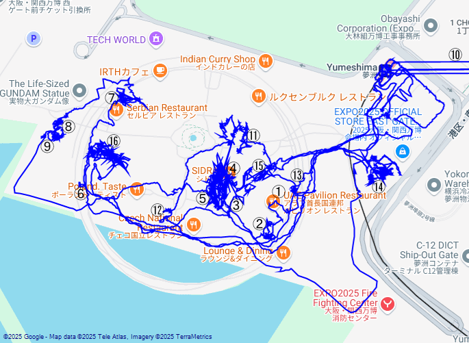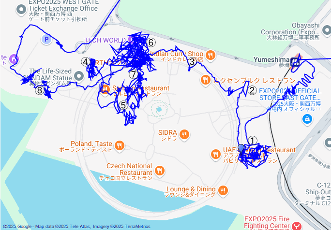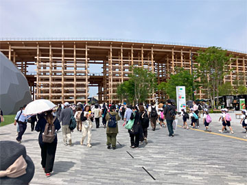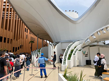 この日は、上のリストでは、2つの予約がありますが、公式ページの8日前抽選で予約が取れたのがテックワールド。入場してから予約が取れたのがブルーオーシャンドーム。昨日24,949歩も歩いたので、足が疲れていましたが(ちなみに2日目の歩数は14,178)、10時から入る人たちには負けたくない(昨日は10時に入れなかった)ので、早めに来て正解、日本館に並ぶことが出来ました。日本館は藻を使うことで二酸化炭素を削減しよう、という地味な内容でしたが、まじめで、木材を使って丸く取り囲んだ建物が大屋根リングとも良く調和していて、良かった。