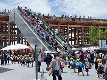 大屋根リングに上がるエスカレーター。エスカレーターは自分で足を持っていて、大屋根リングには寄りかかっていません。