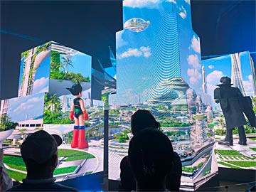 大きな円柱型の電子スクリーンと、その周囲に設置されたタブレット端末に同時に映像が映し出されます。