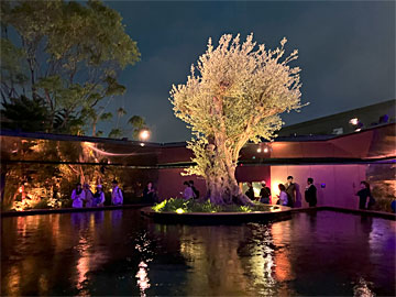 中庭にあるのは、樹齢千年のオリーブの樹。雨で水面が揺れて、幻想的な感じ。
