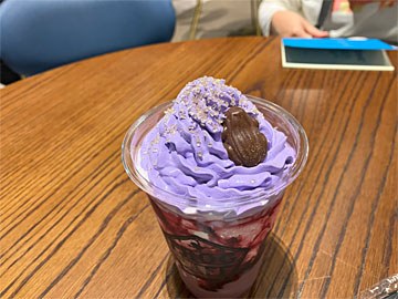 フロッグカフェで、アサイー&ブルーベリーのミルクシェイクを購入(¥950)。チョコレートのフロッグが乗っています。