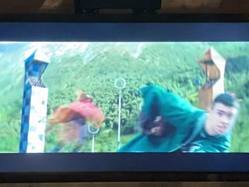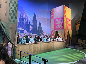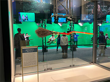 クィディッチの試合にエキストラで参加するコーナー。左のスリザリンと右のグリフィンドールに分かれて、試合を応援しているていで、係の人の指示に合わせて、応援したりブーイングしたりすると、シーンを合成したビデオが出来上がります。