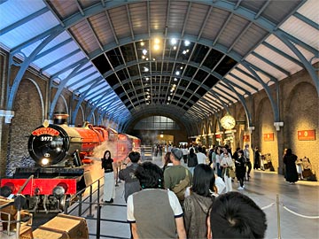 9と4分の3番線にあるレイルウェイショップ(駅の売店)で、グリフィンドール(オレンジ)のネクタイを購入(¥3,200)。色移りするかもしれませんが、シルク100%だそうですし、ネクタイとしてはそんなに高くはない印象。その場で着用してみました。これでハリーの仲間になれた気分。魔法のローブは¥13,000で(当方は買いませんでしたが)着ている人もかなりいました。魔法のつえは¥4,900で、こちらも持っている人があちこちいました。