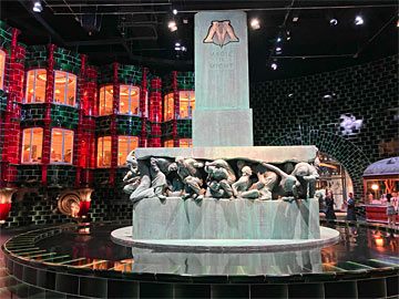 東京でしか見られない「ロンドン魔法省」のフルスケールセット。周囲のオフィス棟も手が込んでいますが、実際は木とか紙とで作られているので、撮影の時にキャスト(演者)の人は入れず、スタントの人だけが入れた、とのこと。緑のタイルも実は木製で、セラミックタイルに見えるようにラッカー塗装されているのだそう(リンク)。