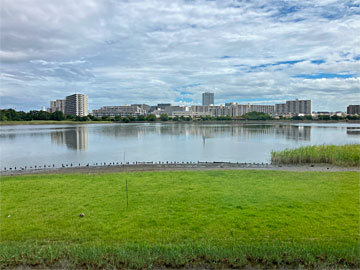建物は、谷津干潟に向かって、バーンと開けています。でも、こちらは海の方向ではなく陸地側で、干潟の奥にはマンション群が広がっています。