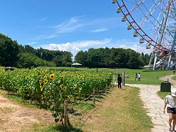 川(旧江戸川)を渡り、葛西臨海公園に来ました。観覧車の近くにひまわり畑があります。